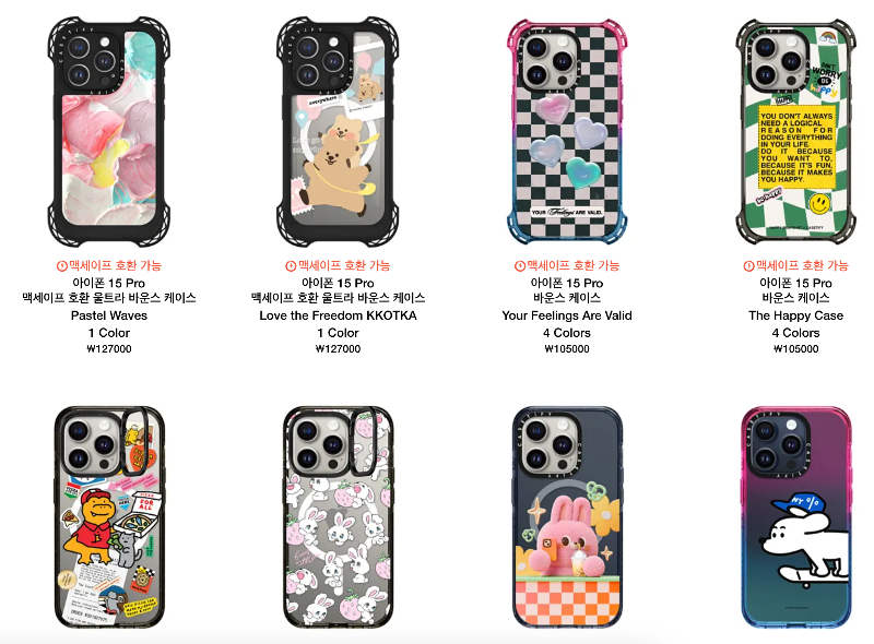 케이스티파이는 많은 인플루언서 및 연예인들이 사용하는 브랜드로 독특하고 귀여운 케이스를 많이 판매합니다. 벌써 아이폰 15 시리즈의 케이스들이 출시되고 있는데요. 이미 골라두었다가 휴대폰이 출시되면 함께 구매하여 나만의 아이폰을 꾸미는 데 사용해 보세요!