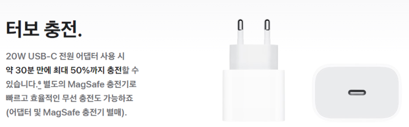 아이폰 15에서도 전작과 마찬가지로 충전기를 지원하지 않습니다. 애플의 최대 충전 지원속도는 20W로 , 이번에도 애플의 MFI 인증을 받은 케이블을 지원합니다.