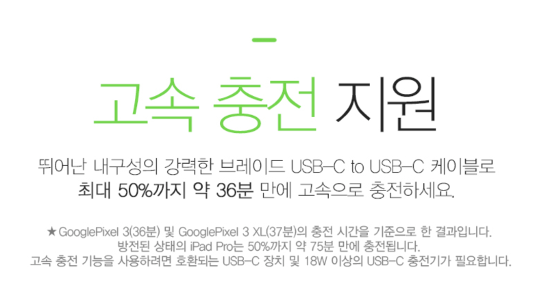 고속충전을 하기 위해서는 충전기뿐만 아니라 케이블 또한 고속충전 지원이 가능한 케이블을 사용해야 합니다. 벨킨의 케이블은 최대 60W 지원으로 아이패드까지 문제없이 충전이 가능합니다.