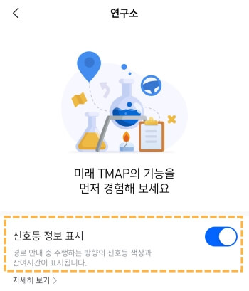 [더보기]-[길안내 설정]-[실시간 교통 신호 안내] 에서 간단하게 설정하실 수 있습니다.