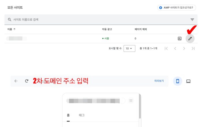 로그인 후 광고 버튼을 눌러서 메인도메인 주소에 연결되어 있는 연필버튼을 클릭합니다. 애드샌스에서 하위도메인을 자동으로 인식하면서 설정을 따로 할 수 있는 곳이 없어져버렸습니다.