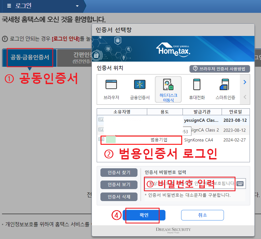 2. 공인인증서 창이 뜨면 범용공인인증서 선택 후 비밀번호 입력하여 확인버튼을 누른다